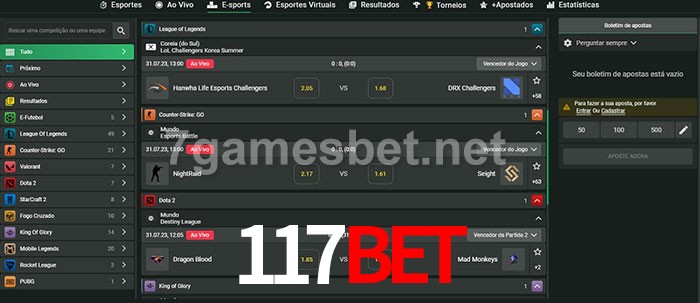 O 117bet oferece uma grande seleção de opções de apostas em e-sports com probabilidades competitivas